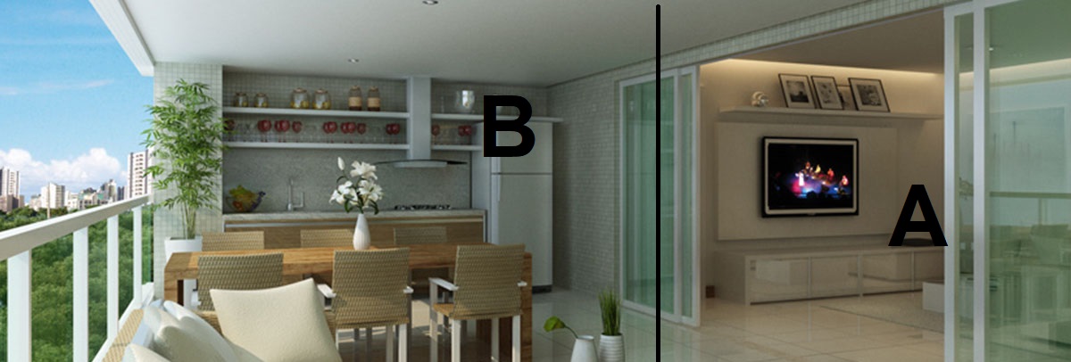 Na Instalação de Caixas de som em apartamentos, uma grande demanda e fazer dois ambientes, na foto abaixo temos ambiente A que representa a área que você tem com televisão geralmente em sistema multicanal de áudio, mais conhecido como home theater e na varanda, geralmente pode até ter televisão mas num sistema estéreo.